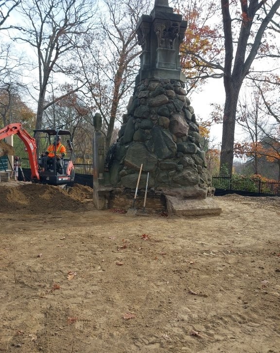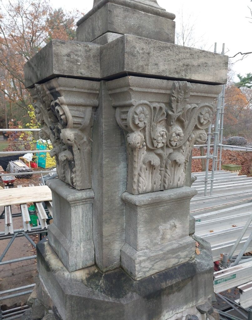 The project faced significant technical and conservation challenges. Century-old joints, uneven masonry, structural deterioration, and incomplete documentation required advanced planning and careful execution. Before any dismantling could begin, extensive risk assessment was conducted. The entire upper structure—including the finial, double-pediment masonry, and internal brick cores—had to be catalogued, delicately dismantled, repaired, and rebuilt. The iron fencing, believed to have been salvaged from St. Paul’s Cathedral in the UK, and intricate details like the Maltese cross, added complexity to both conservation and historical interpretation. Deterioration to the fieldstone and rubble masonry cairn also required deep repointing, back-pointing, and injection-grouting to consolidate it. Individual carved Queenston limestone and Vermont marble elements were cleaned and repaired. Cracked or eroded stones were strengthened with epoxy grouting and organic consolidant application and the upper portion of the monument was rebuilt.