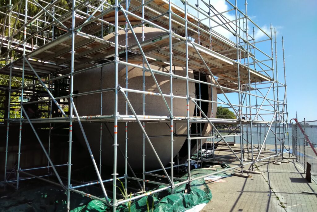 The restoration project faced significant challenges. Structural cracking in the precast concrete sphere’s support required a fast-setting, colour-matched repair mortar with corrosion inhibitors to maintain both strength and appearance. Preserving the weathered look of the steel while ensuring durability called for specialized Cor-ten weathering steel. The sculpture’s location over a shoreline in a park prevented use of heavy machinery; therefore, all materials and steel components were manually moved and installed with traditional block and tackle equipment supported by access scaffolding. Temporary supports were carefully engineered to stabilize delicate cast elements while allowing repair access. Additionally, complex cleaning was needed to remove layers of graffiti without damaging the surfaces or harming the environment.