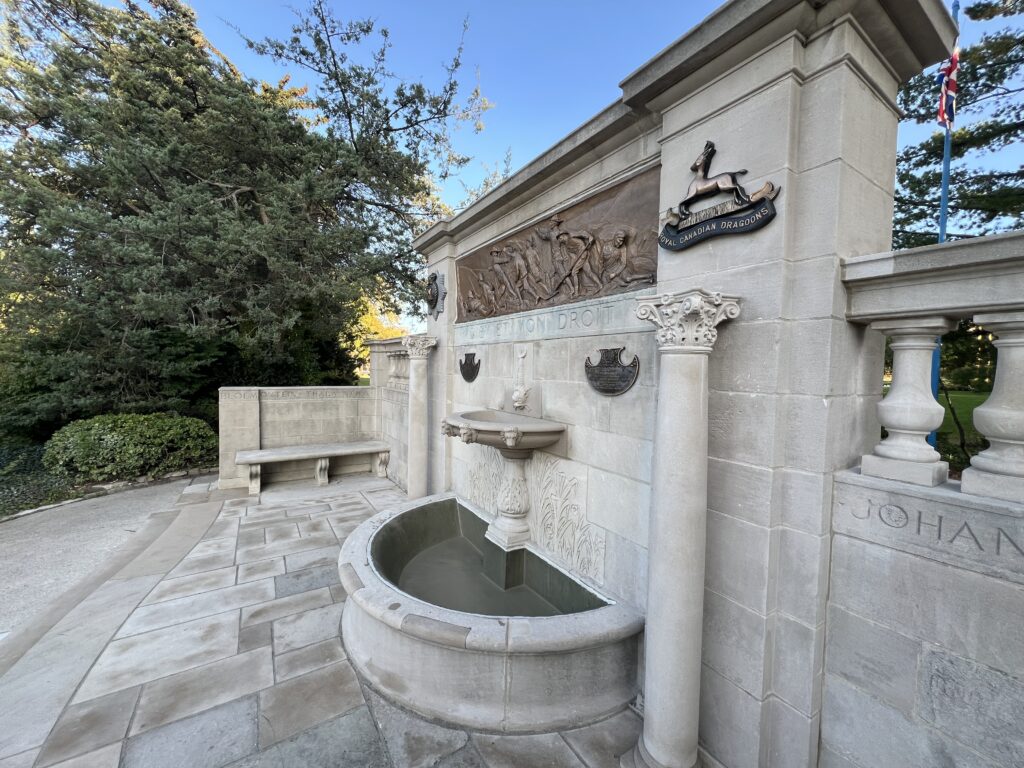 Over its 100+ year life, the memorial underwent multiple relocations, reflecting the city’s changing urban landscape. Most recently, it was restored and re-dedicated in 2024, after decades of exposure and deterioration. This conservation effort brought forward several major challenges, including repairing aged and damaged stone, carefully removing and reinstalling existing pavers over a new drained granular base, replacing concrete walks and stairs, and performing extensive masonry interventions. Bronze Regimental plaques and a large, high relief commemorative panel were removed and conserved in the workshop and prepared for reinstallation with new mounting systems as part of the restoration scope. Due to the delicate historic fabric and the inclusion of veteran names and inscriptions, all work had to be approached with extreme precision and care. New electrical and drainage systems were installed to preserve the structure long term. Aquatic elements, such as a new fountain and a stone sculpture, were introduced to pay homage to its origins as a memorial fountain.